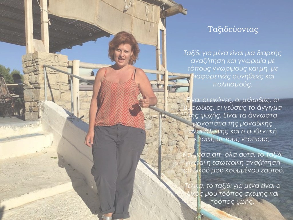 Ταξίδι για μένα είναι μια διαρκής αναζήτηση και γνωριμία με τόπους γνώριμους και μη, με διαφορετικές συνήθειες και πολιτισμούς.